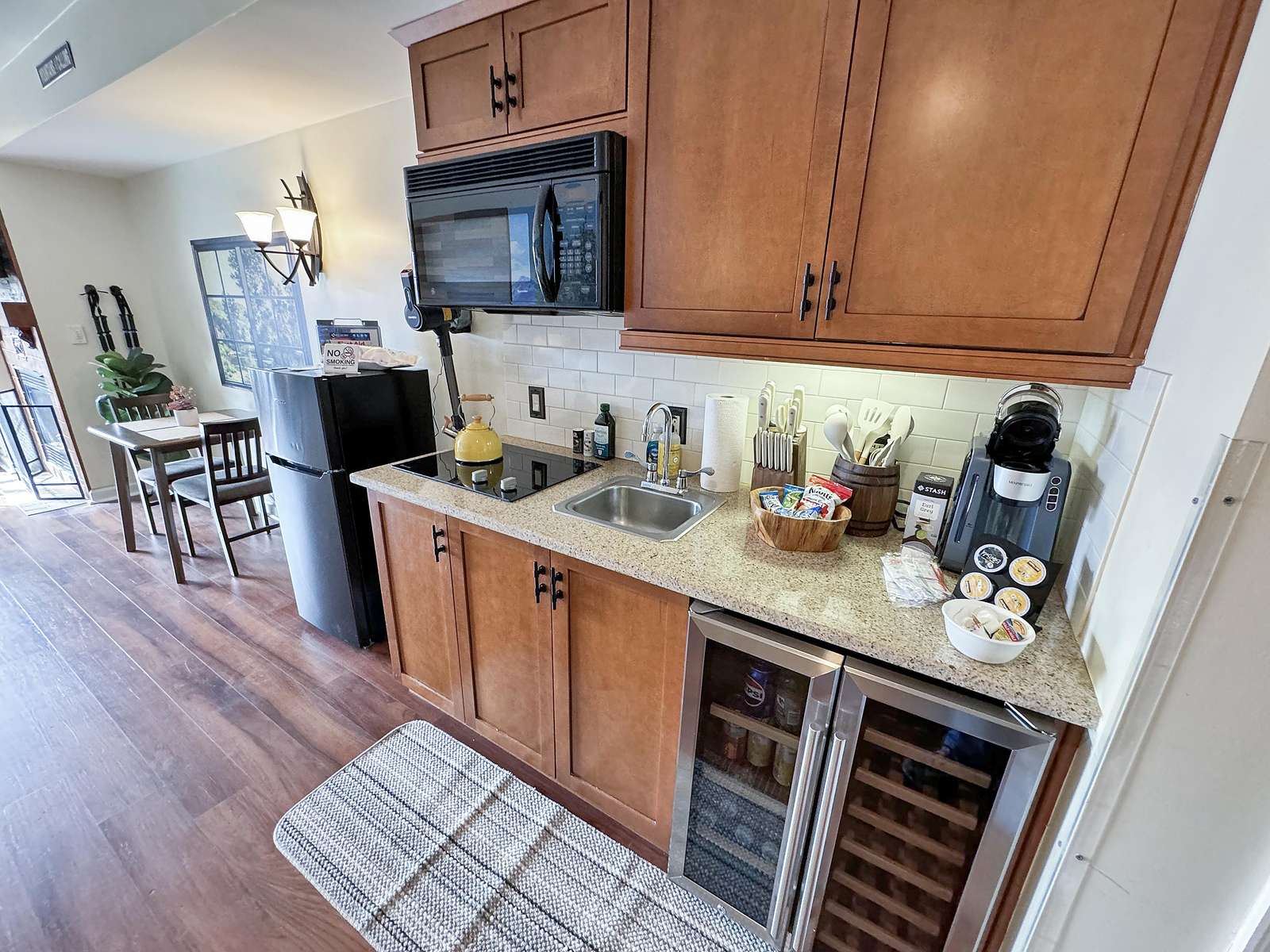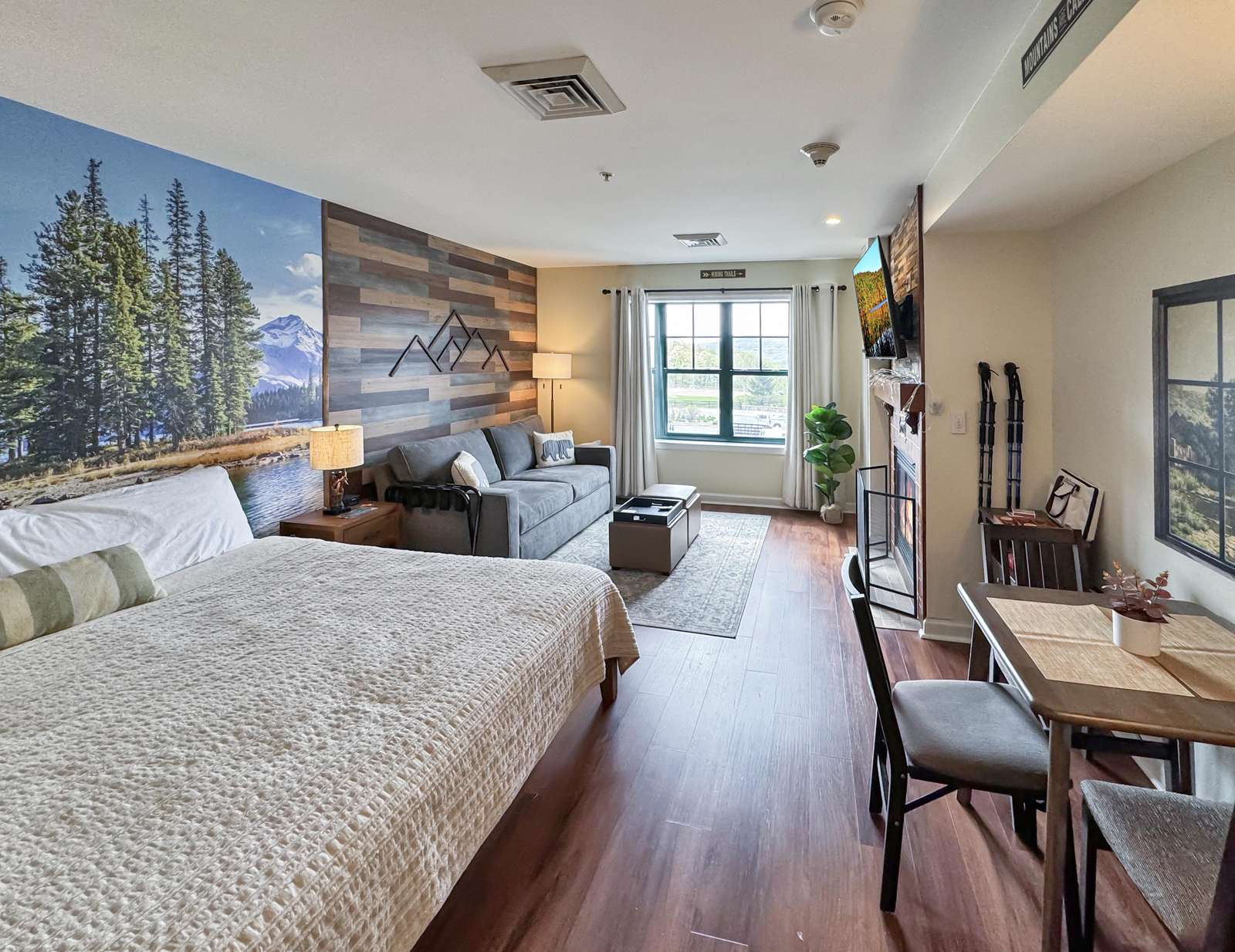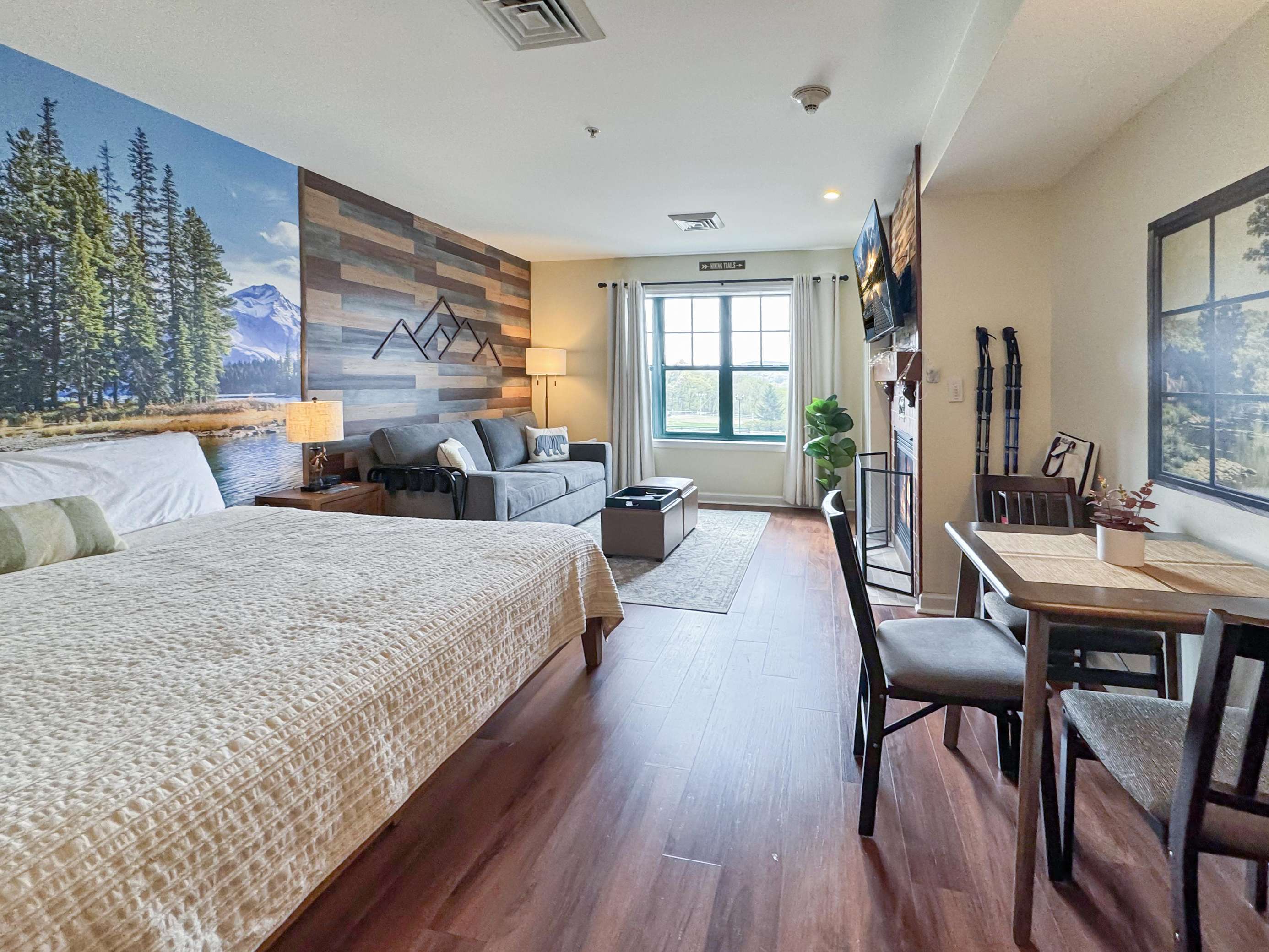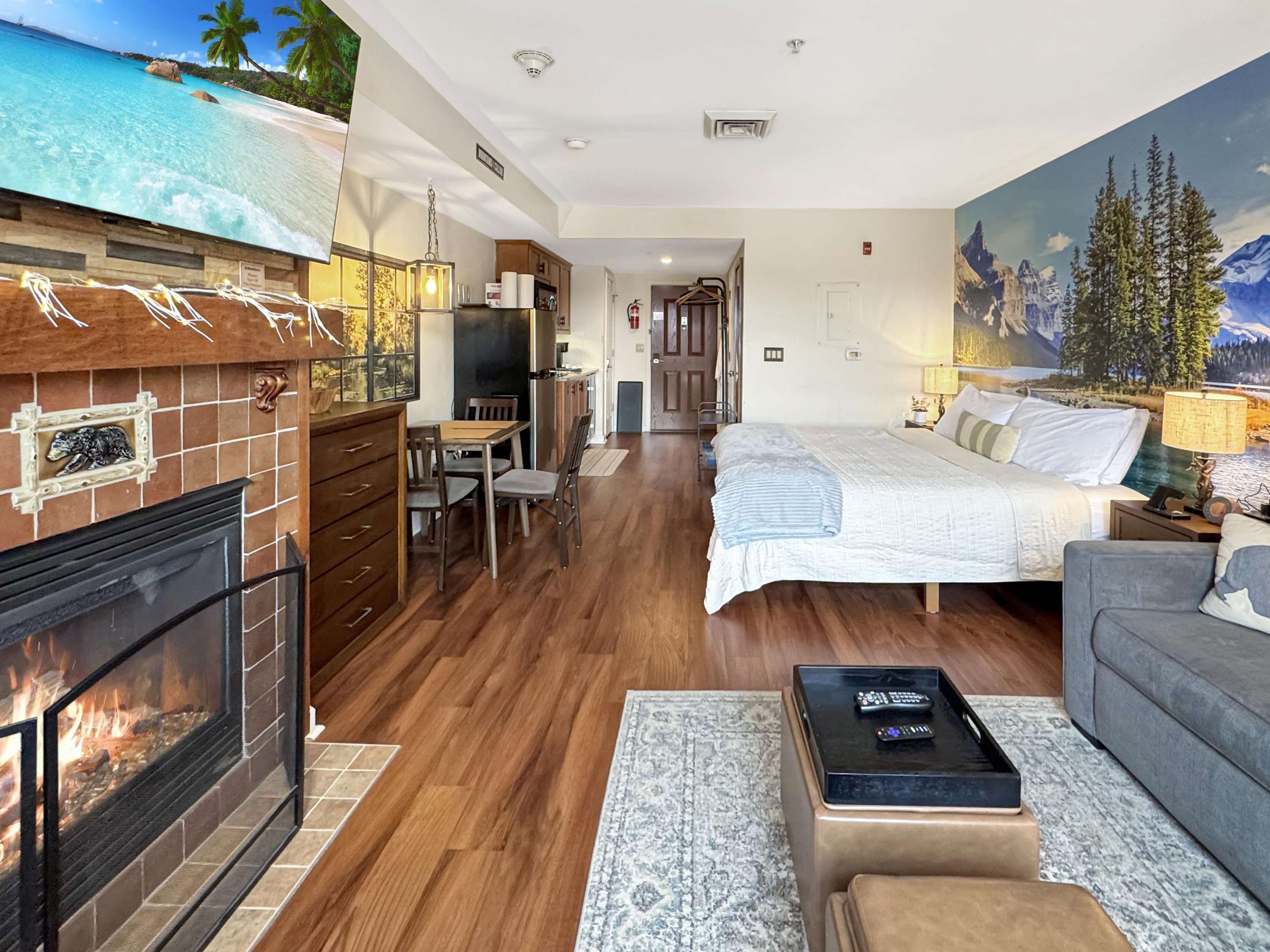 This beauty features a NEW King size bed, a living room area with a new pullout sofa, storage ottomans, gas fireplace, kitchenette with pots and pans, a ceramic stove top, near full fridge, luxury wine and beverage fridge, microwave, K-cup coffee-maker, toaster, 2-4 person dining table, Air Purifier, Liv Vac (safety), Wall Hooks, Hiking Poles and a full bathroom with a towel warmer.
