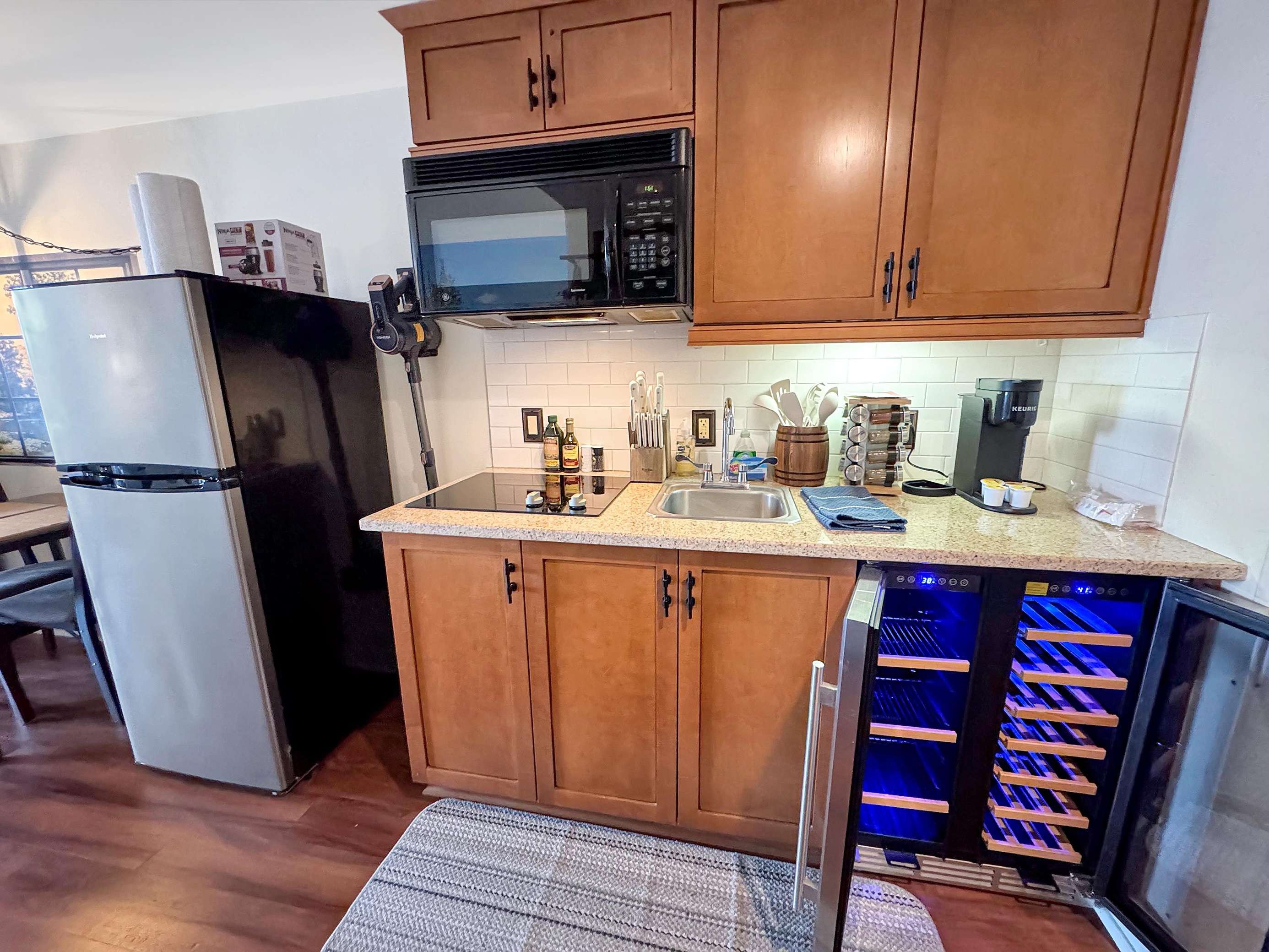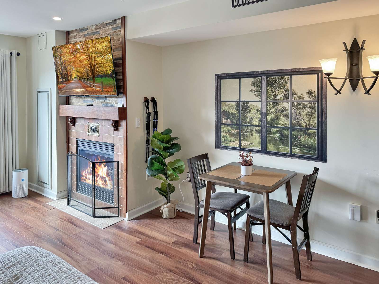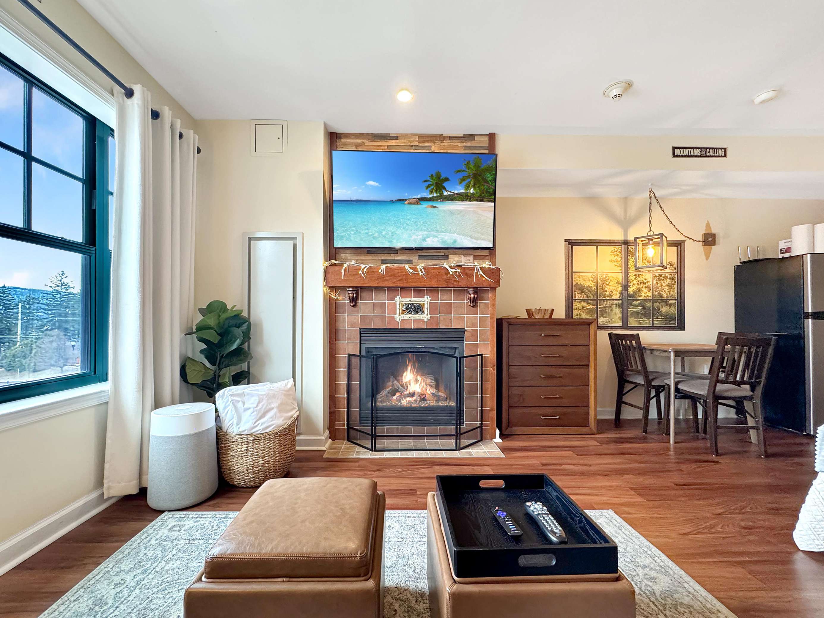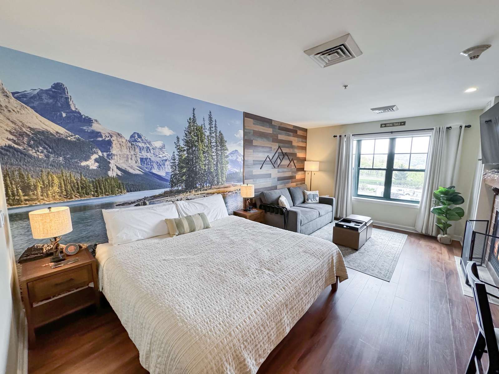 This beauty features a NEW King size bed, a living room area with a new pullout sofa, storage ottomans, gas fireplace, kitchenette with pots and pans, a ceramic stove top, near full fridge, luxury wine and beverage fridge, microwave, K-cup coffee-maker, toaster, 2-4 person dining table, Air Purifier, Liv Vac (safety), Wall Hooks, Hiking Poles and a full bathroom with a towel warmer.