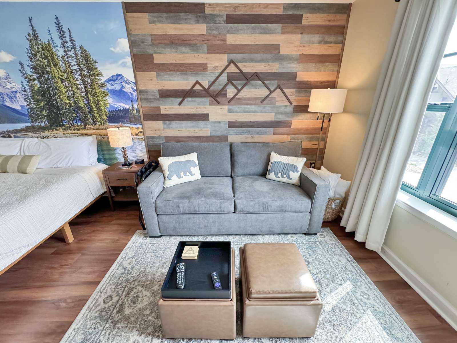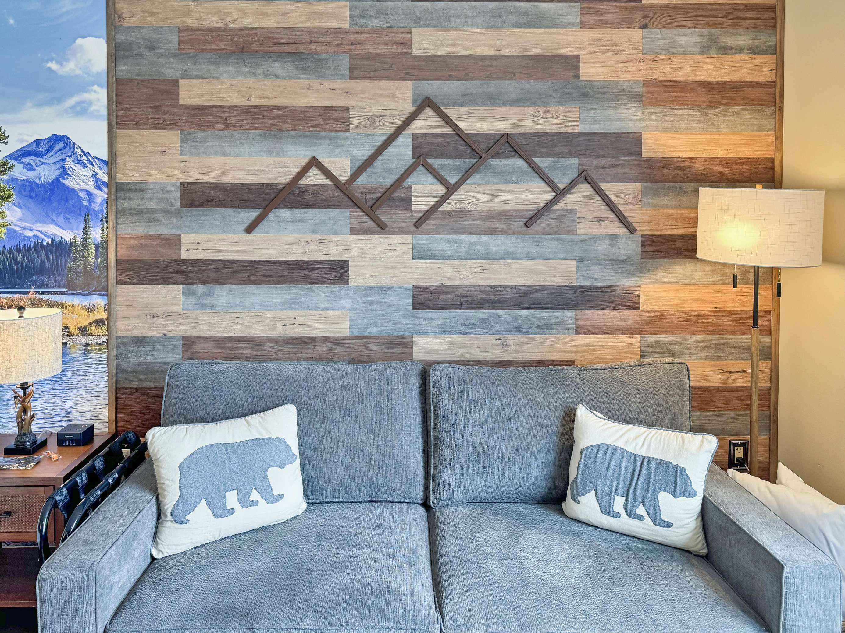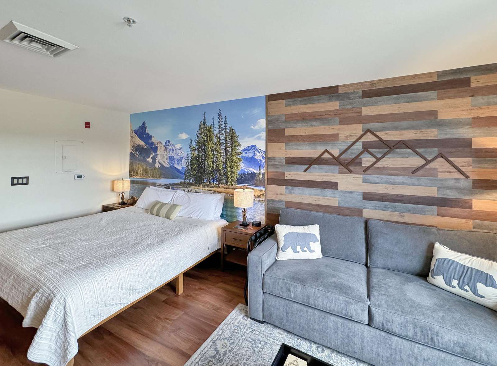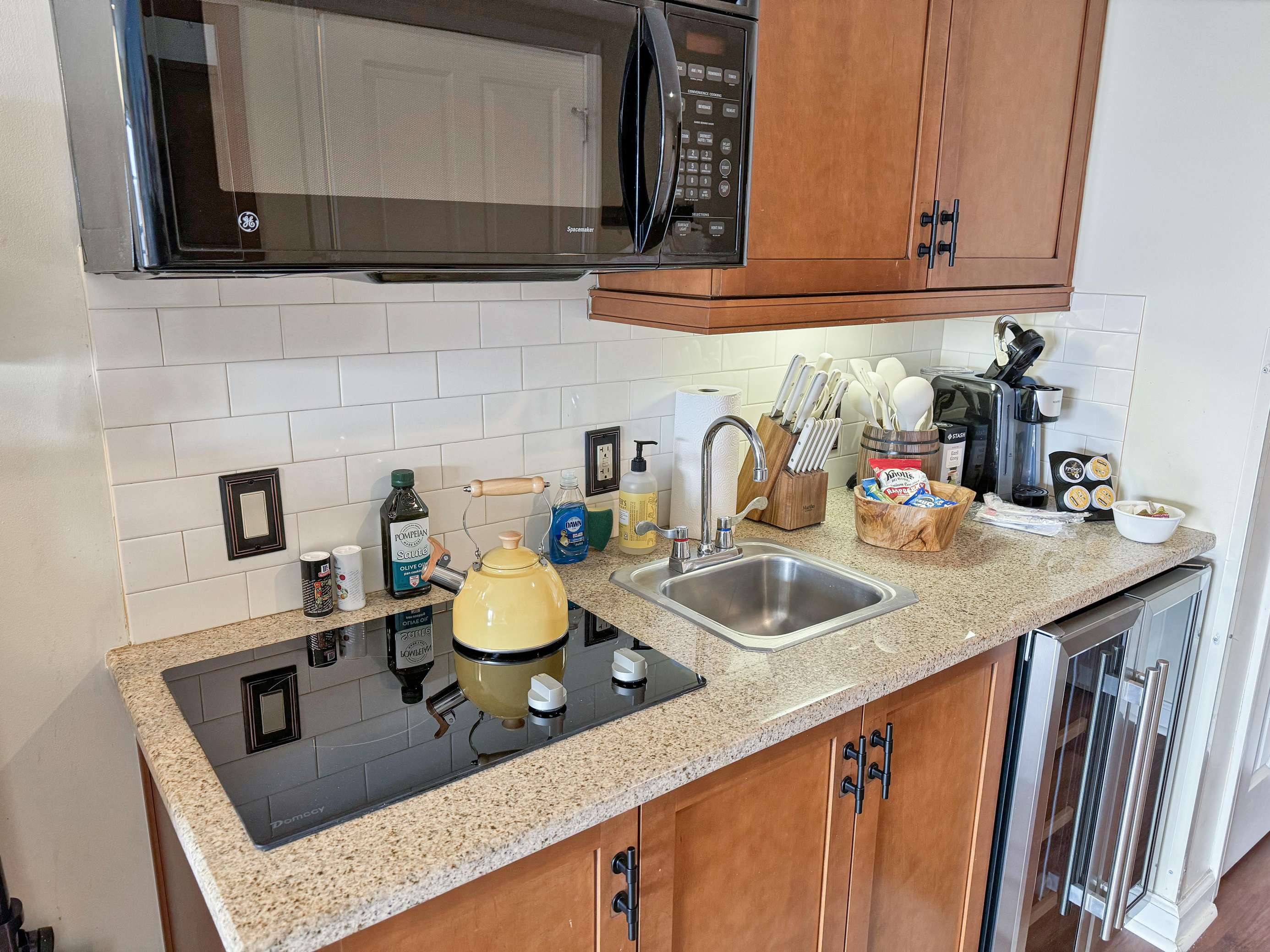 This beauty features a NEW King size bed, a living room area with a new pullout sofa, storage ottomans, gas fireplace, kitchenette with pots and pans, a ceramic stove top, near full fridge, luxury wine and beverage fridge, microwave, K-cup coffee-maker, toaster, 2-4 person dining table, Air Purifier, Liv Vac (safety), Wall Hooks, Hiking Poles and a full bathroom with a towel warmer.