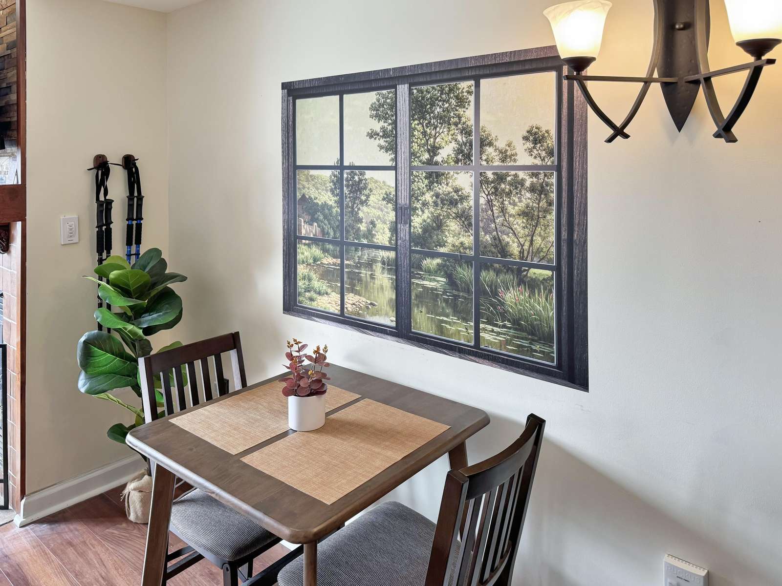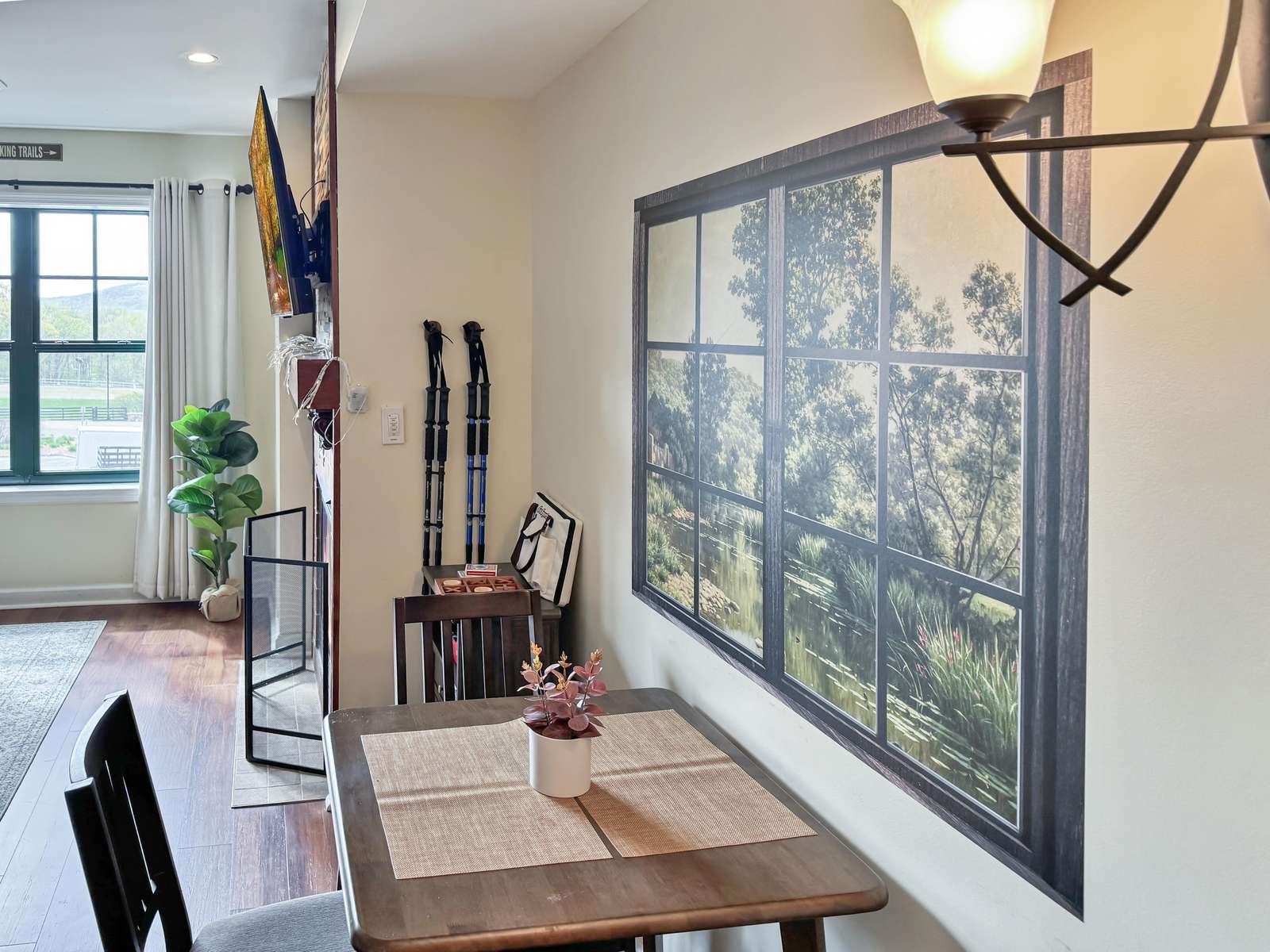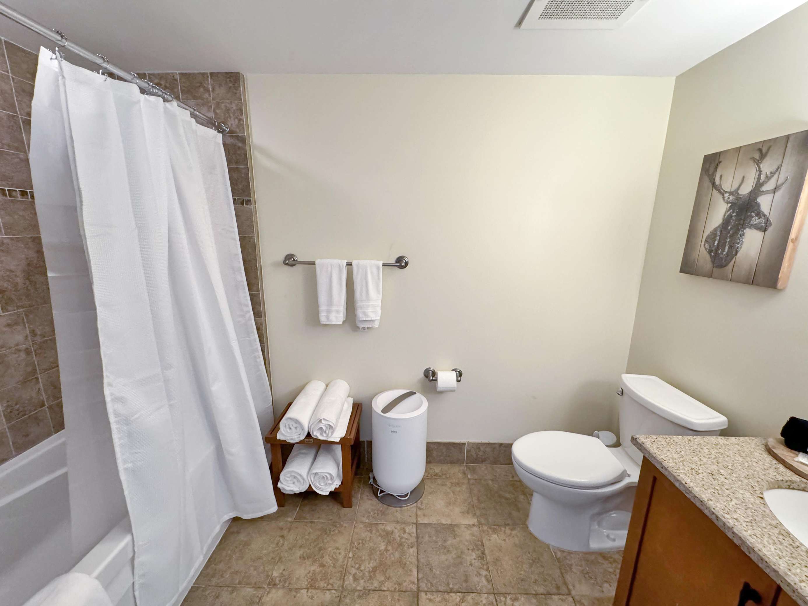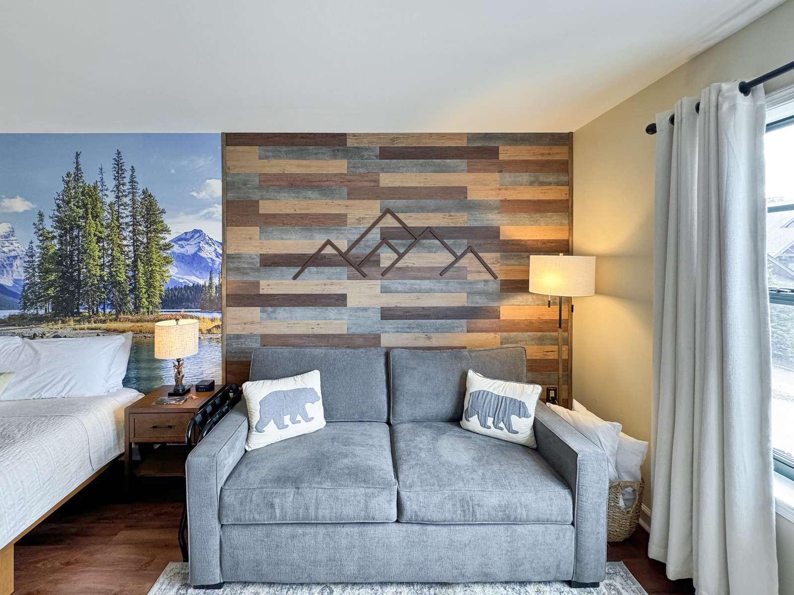 This beauty features a NEW King size bed, a living room area with a new pullout sofa, storage ottomans, gas fireplace, kitchenette with pots and pans, a ceramic stove top, near full fridge, luxury wine and beverage fridge, microwave, K-cup coffee-maker, toaster, 2-4 person dining table, Air Purifier, Liv Vac (safety), Wall Hooks, Hiking Poles and a full bathroom with a towel warmer.