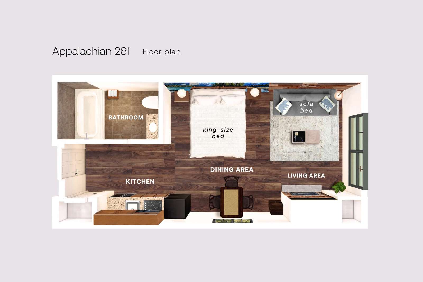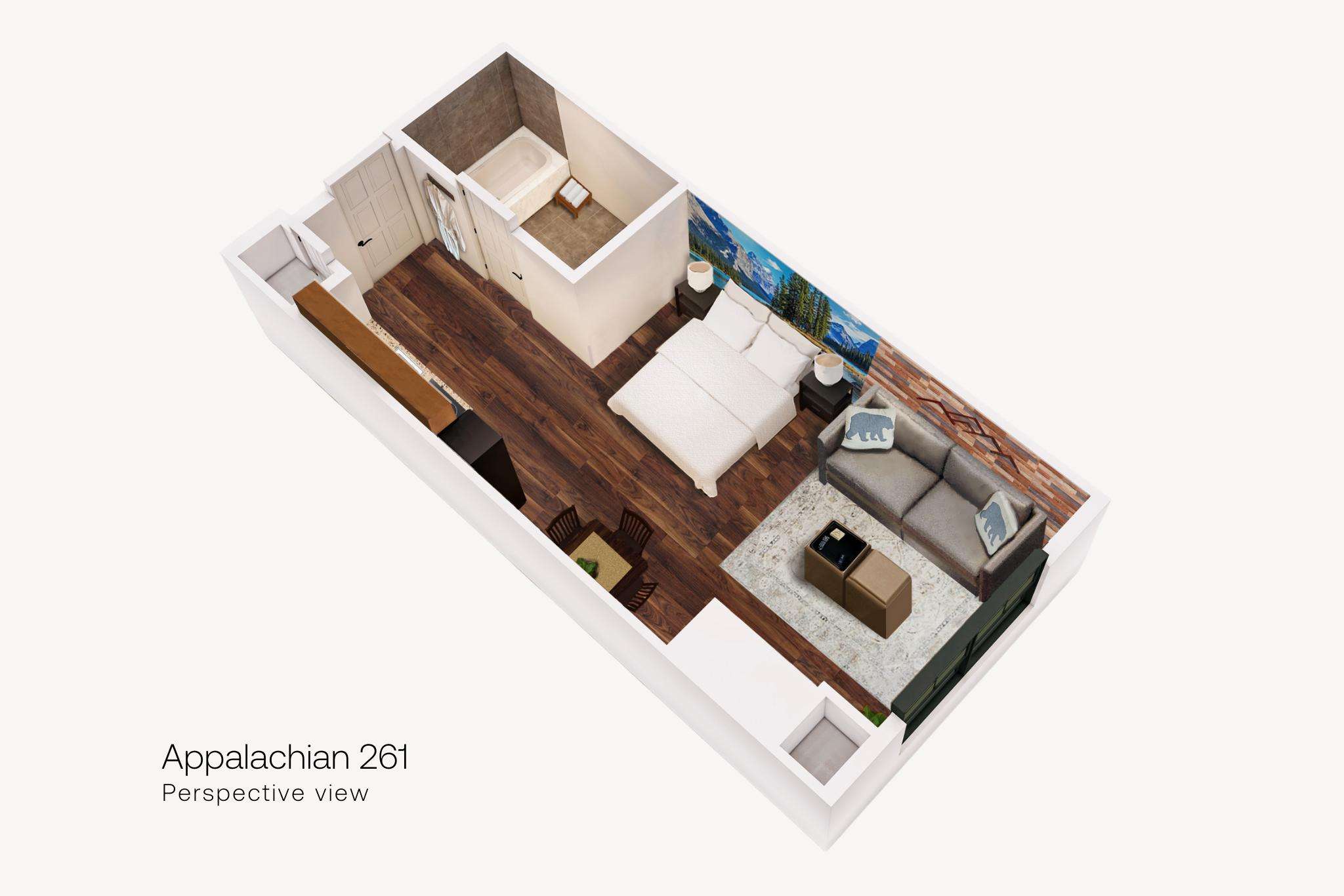 This is a “Premium/Luxury” Mountain and Sunset view STUDIO inside The Appalachian Hotel located at the base of the Mountain Creek Ski, Bike and Water Park Resort.