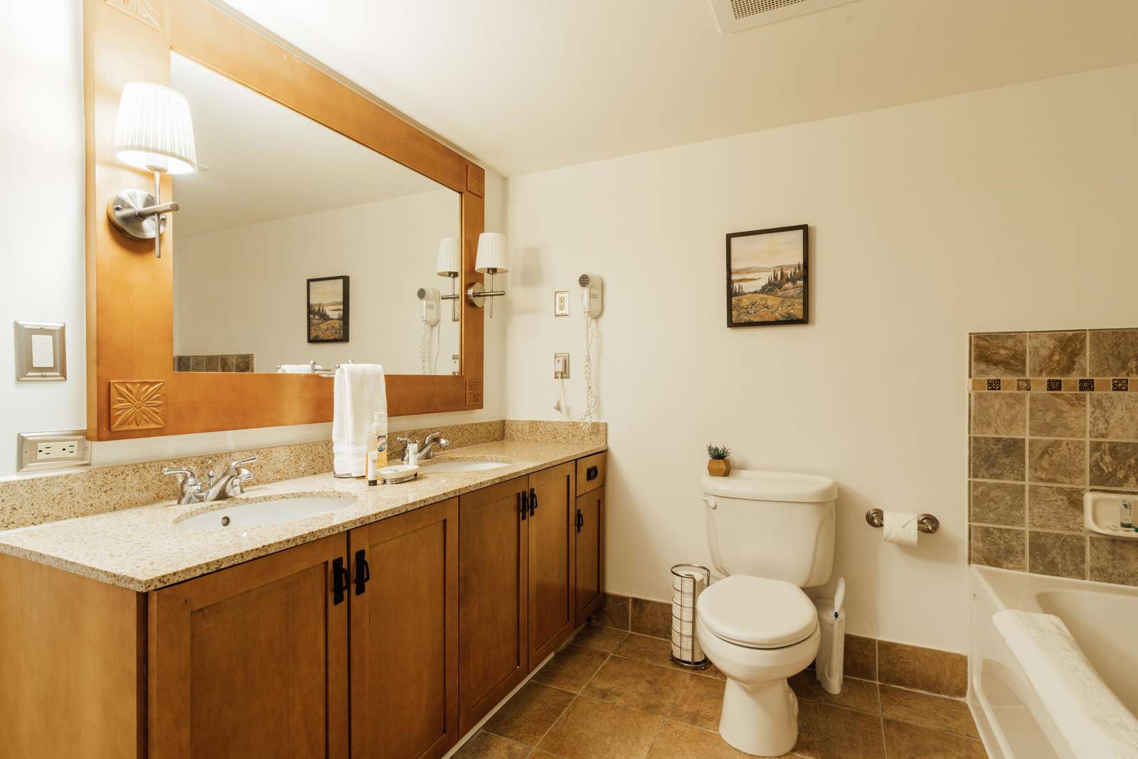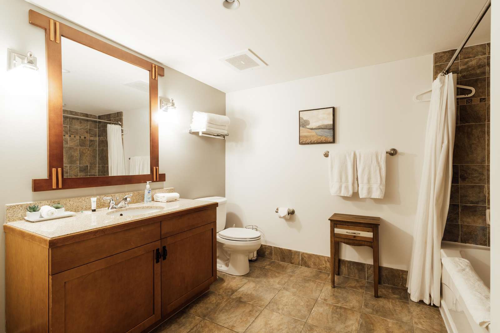 This beauty features one king size bed, 2 queen beds, a living room area with a pullout sofa, fireplace (gas or electric), full kitchen with an oven, large fridge, microwave, K-cup coffee-maker, toaster, 6 person dining table, and 2 full bathrooms.