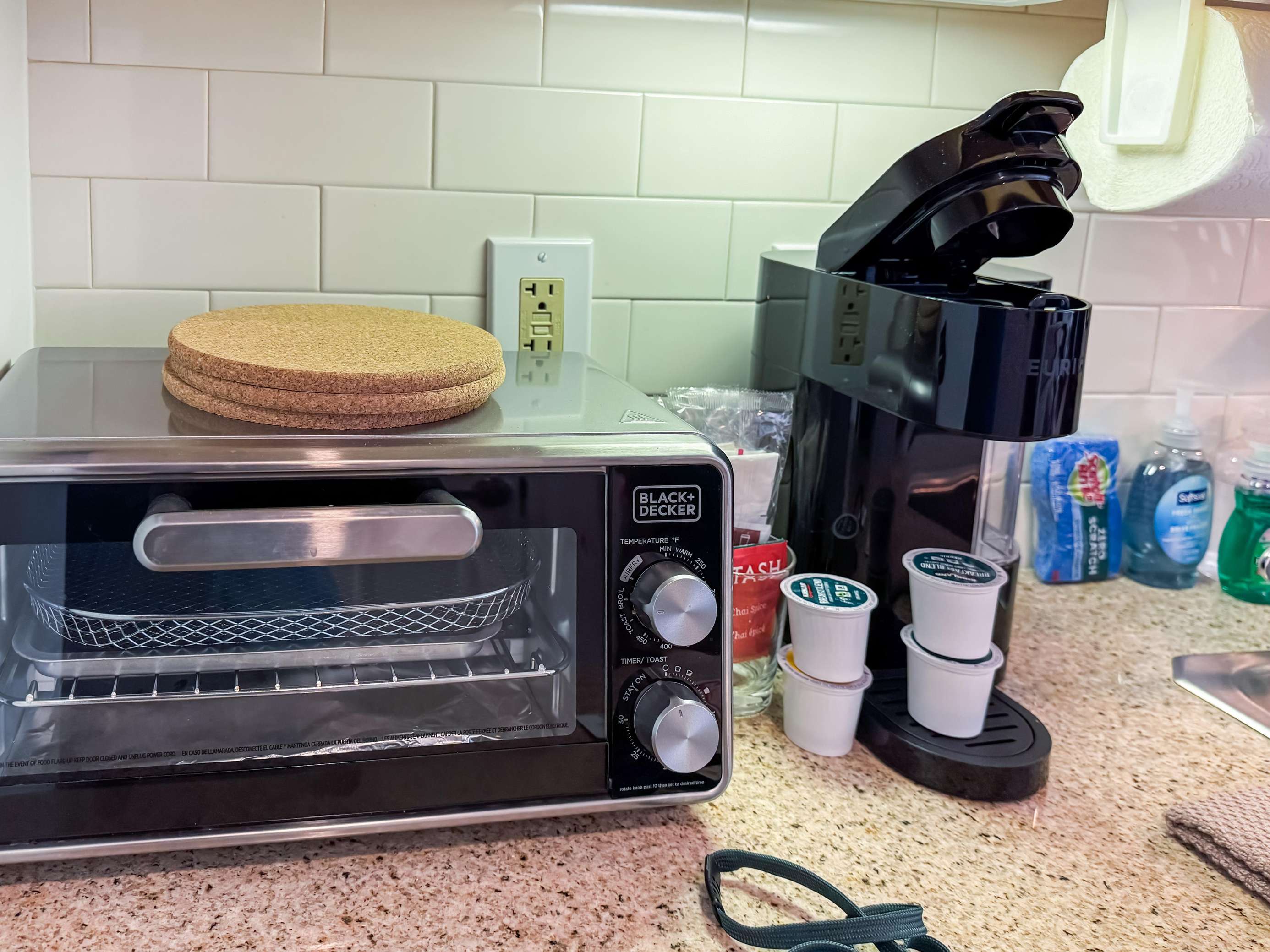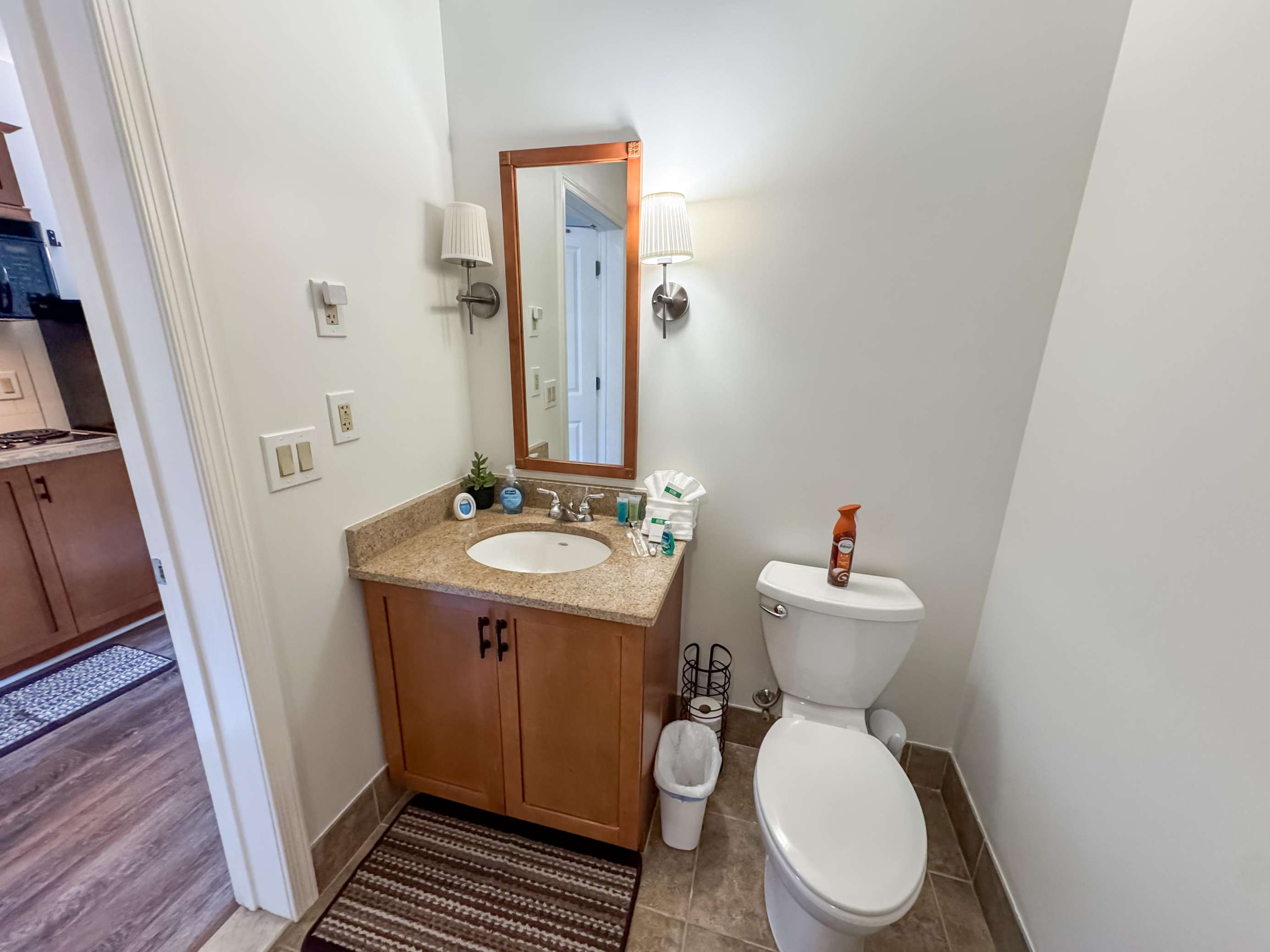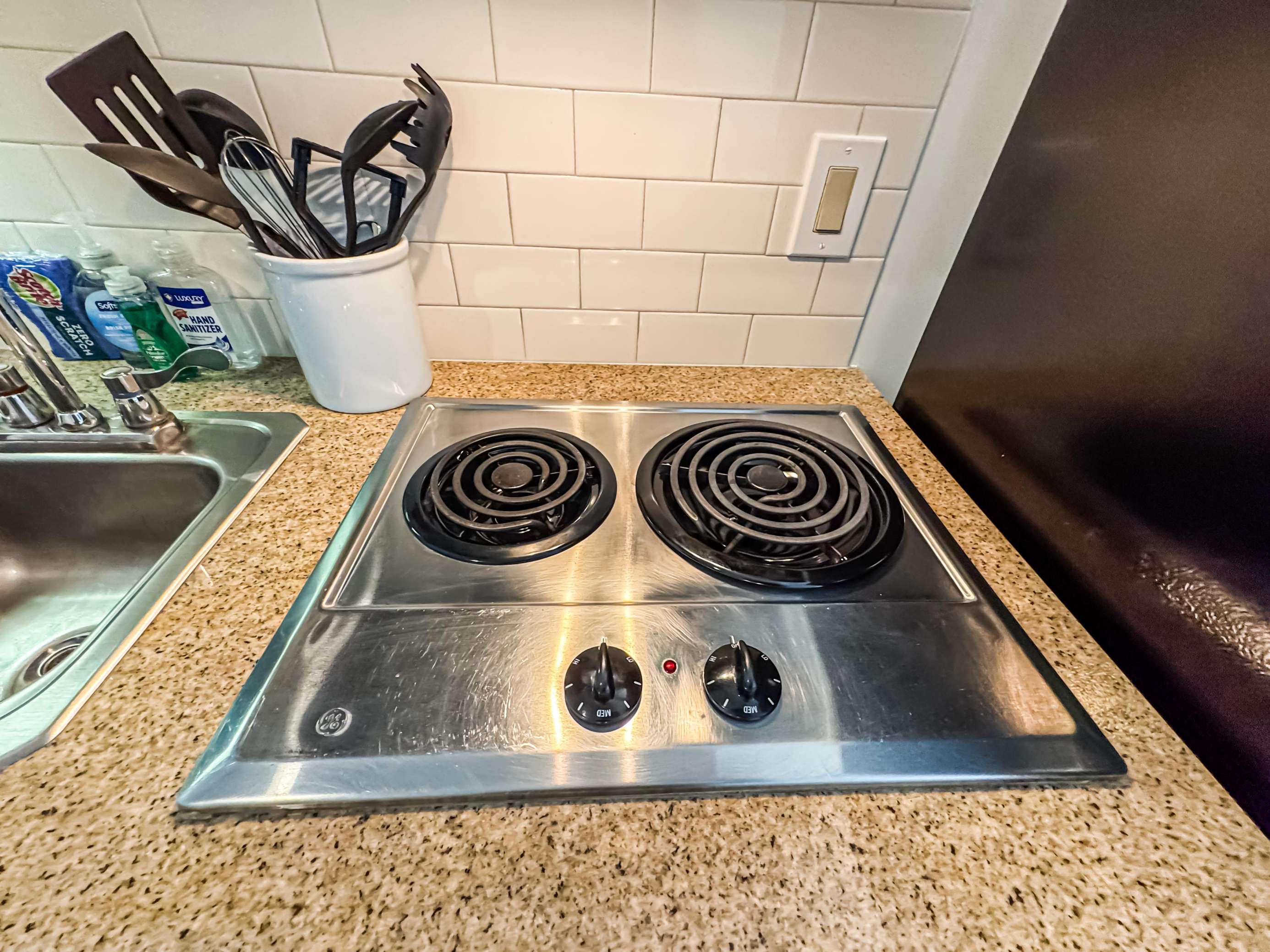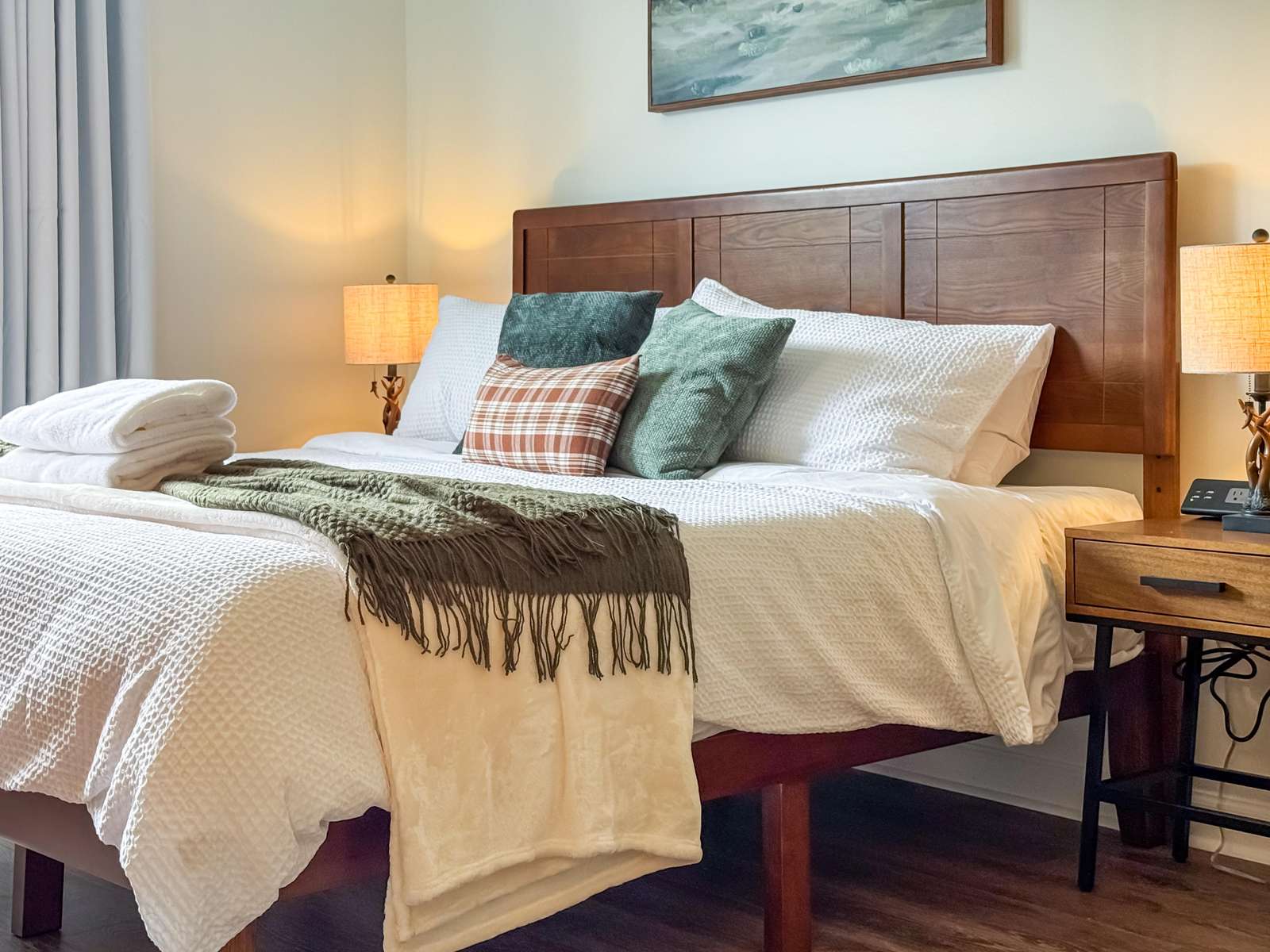This beauty features a comfy King size bed, a living room area with a new pullout sofa mattress, storage ottomons, gas fireplace, kitchenette with pots and pans, a stove top, near full fridge, microwave, Keurig, toaster, 4 person dining table, dresser, and a full bathroom.